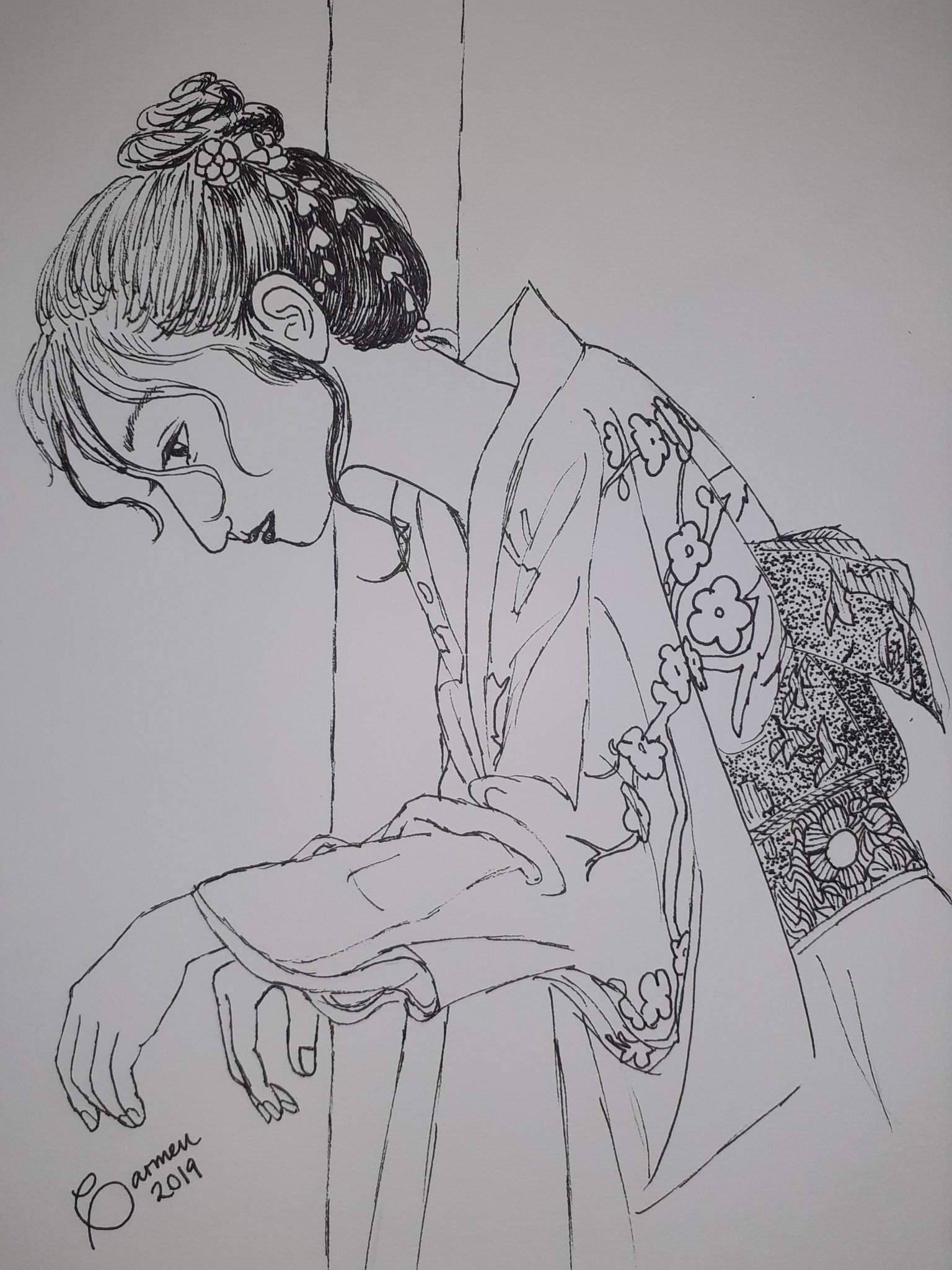 Ayer terminé el reto Inktober en su edición 2019. Realmente no me ceñí a ninguna lista. En general, dibujé chicas con kimono, aunque no todos los dibujos lo incluyen. Tomé fotos de damas en Instagram y pinterest y las dibujé a mi gusto, usando un rapidógrafo.